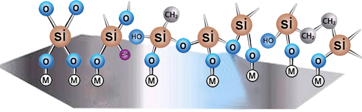 硅烷水解產(chǎn)物中的-SI-OH基因與金屬表面Me-OH基因形成氫鍵,快速吸附于金屬表面。